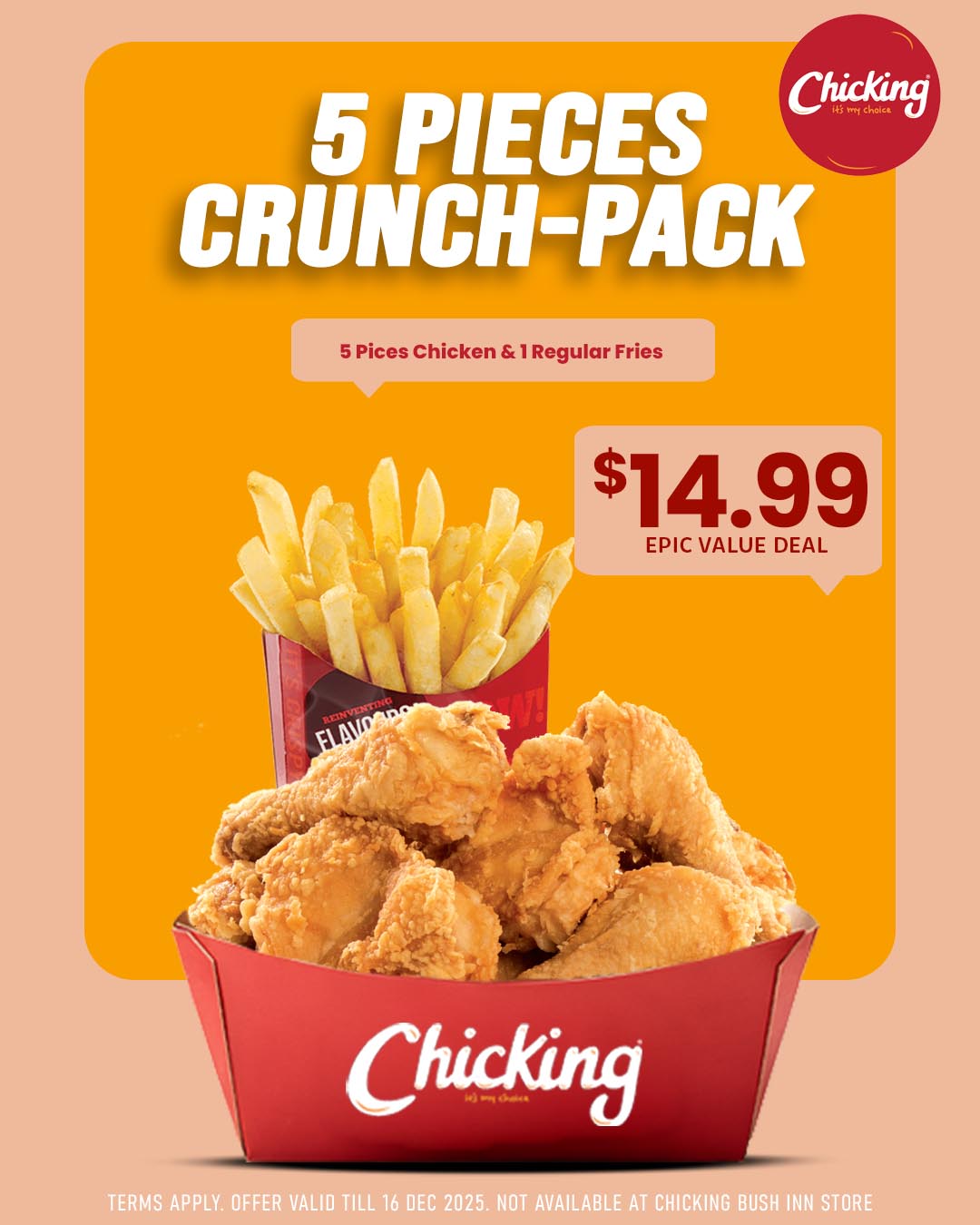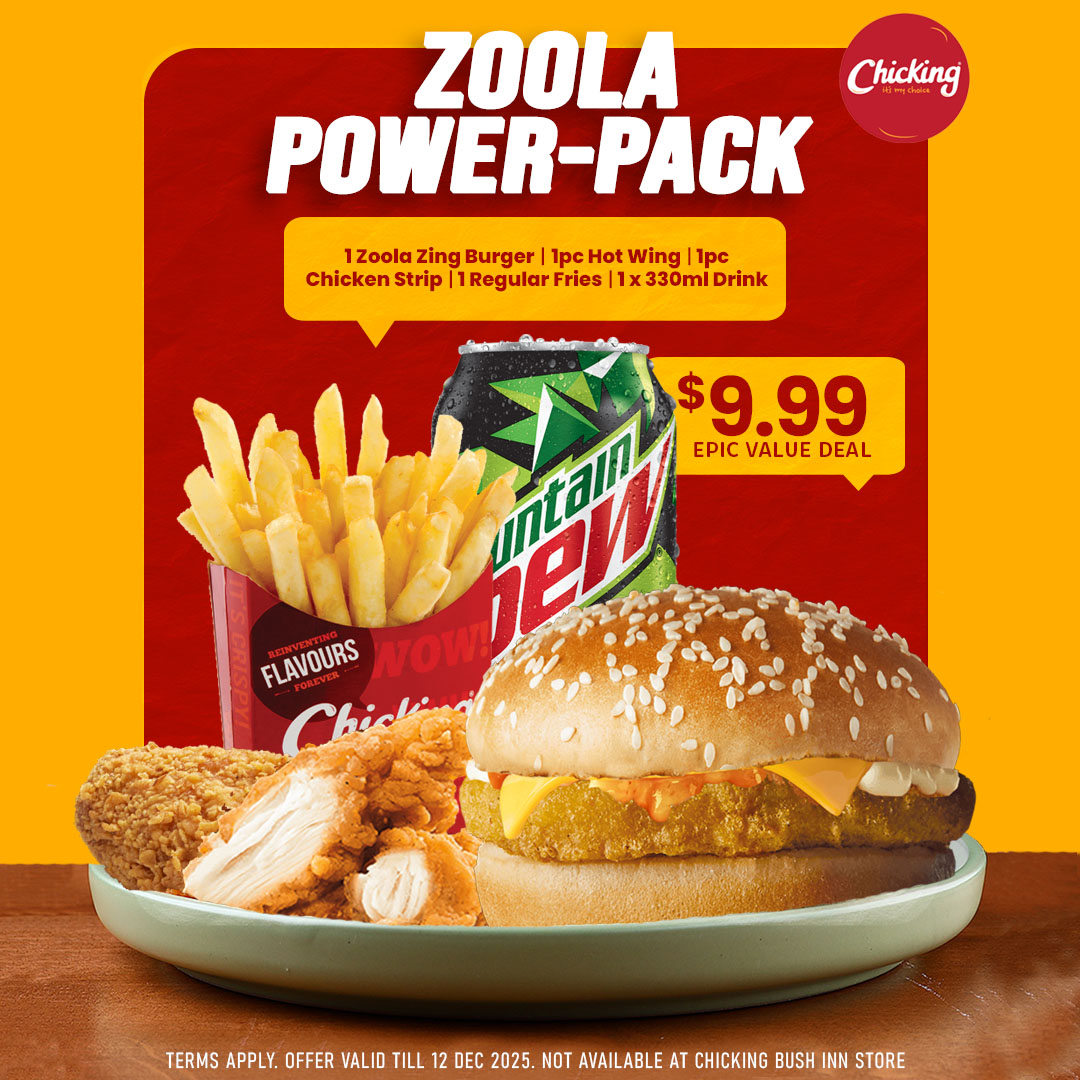 1 Zoola Zing Burger | 1pc Hot Wing | 1pc Chicken Strip | 1 Regular Fries | 1 x 330ml Drink