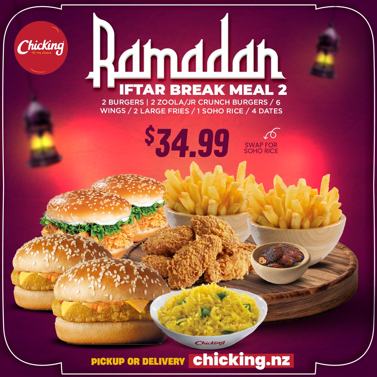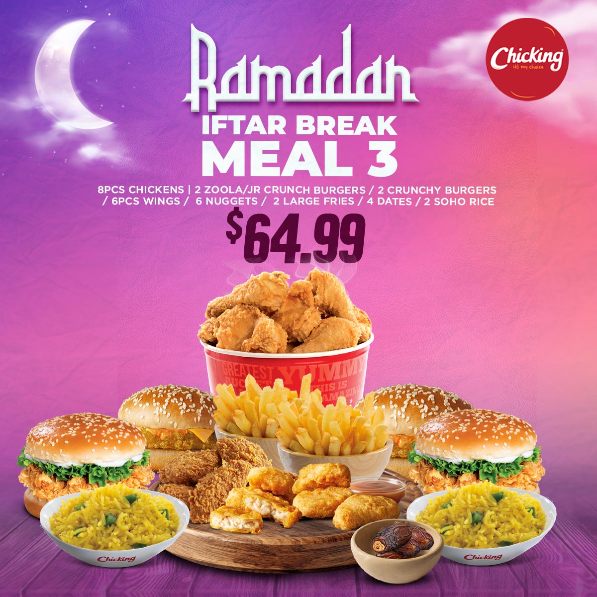 8PCS CHICKENS | 2 ZOOLA/JR CRUNCH BURGERS / 2 CRUNCHY BURGERS / 6PCS WINGS / 6 NUGGETS / 2 LARGE FRIES / 4 DATES / 2 SOHO RICE