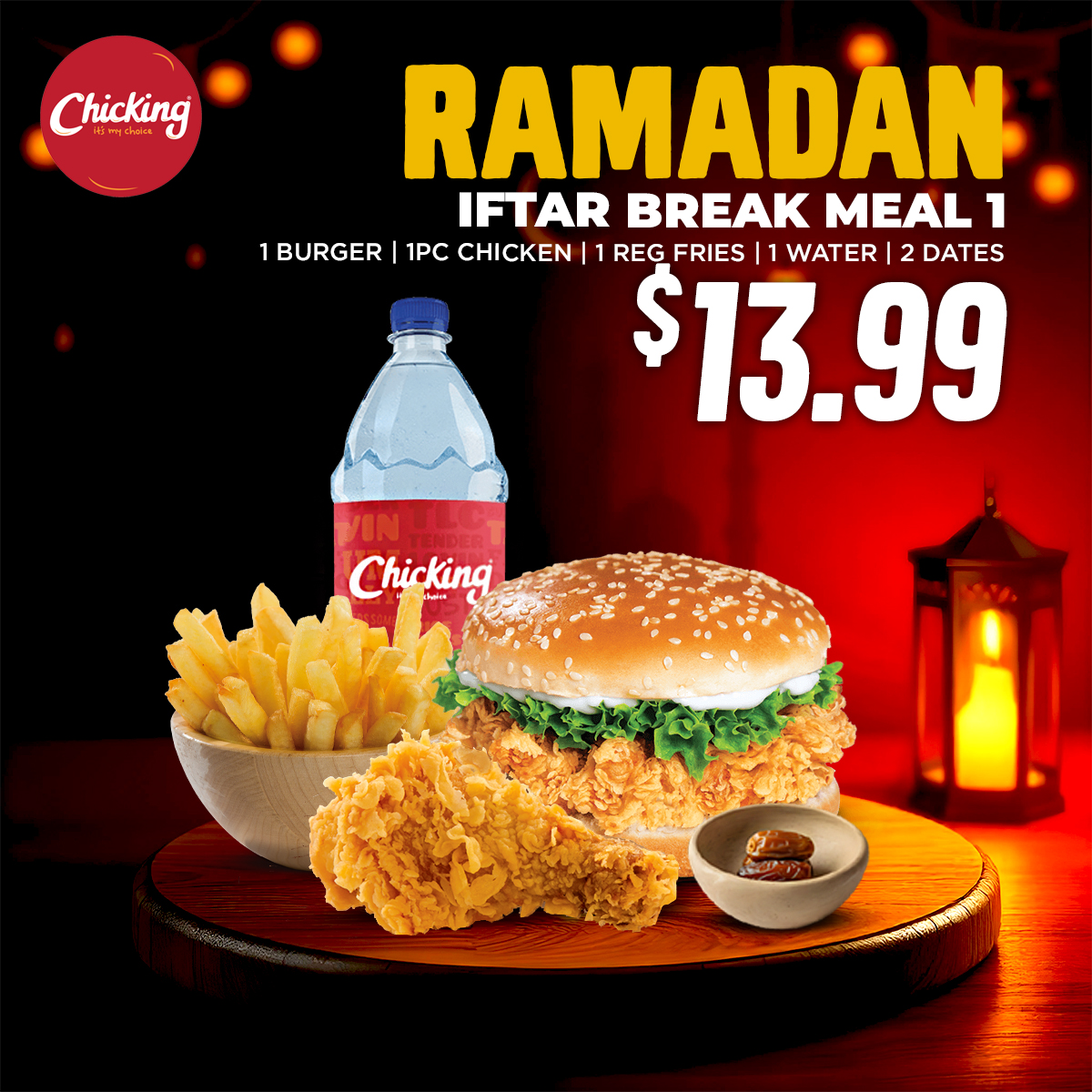 1 CRUNCHY BURGER | 1PC CHICKEN | 1 REG FRIES | 1 WATER | 2 DATES
